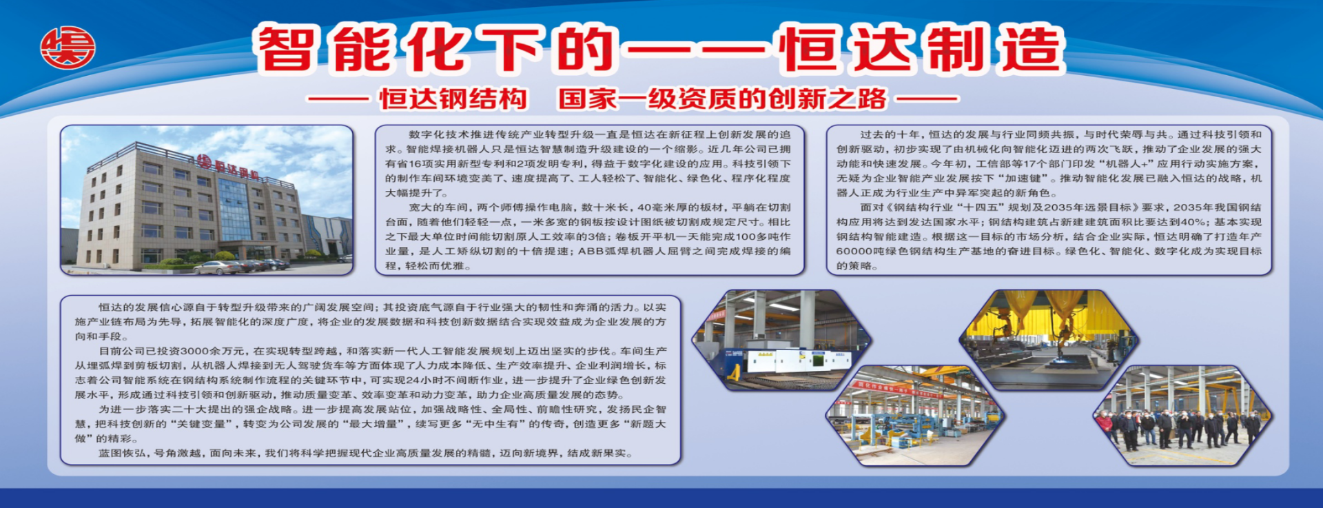山西恒達(dá)鋼結(jié)構(gòu)工程有限公司始建于1998年,位于國(guó)家歷史文化名城、晉商故里——山西祁縣,緊鄰208國(guó)道,坐落于省級(jí)經(jīng)濟(jì)開(kāi)發(fā)區(qū),毗鄰喬家大院景區(qū),地理環(huán)境優(yōu)越,交通十分便利?,F(xiàn)有廠(chǎng)區(qū)占地面積200余畝,建筑面積60000平方米。 我公司是一家從事研發(fā)、銷(xiāo)售、制造和施工于一體的大型鋼結(jié)構(gòu)工程企業(yè),同時(shí)也是涂鍍鋼品及配套建筑圍護(hù)材料系統(tǒng)的專(zhuān)業(yè)生產(chǎn)廠(chǎng)商。多年來(lái),逐漸確立了以商務(wù)寫(xiě)字樓、賓館、高層住宅等為主的高層鋼結(jié)構(gòu)建筑體系,以大型煤倉(cāng)、高鐵車(chē)站、體育場(chǎng)館等公共建筑為主的空間大跨度鋼結(jié)構(gòu)建筑體系,以工業(yè)廠(chǎng)房、低溫物流庫(kù)、多層鋼結(jié)構(gòu)建筑等為主的輕鋼結(jié)構(gòu)建筑體系。 我公司現(xiàn)擁有數(shù)條輕鋼結(jié)構(gòu)加工生產(chǎn)線(xiàn)、重型鋼結(jié)構(gòu)加工生產(chǎn)線(xiàn)、箱型梁柱加工生產(chǎn)線(xiàn),同時(shí)配套有全自動(dòng)巖棉保溫復(fù)合板生產(chǎn)線(xiàn)、高鐵聲屏障、抑風(fēng)墻生產(chǎn)線(xiàn),數(shù)控C型鋼生產(chǎn)線(xiàn)及各種規(guī)格的壓型板生產(chǎn)線(xiàn)三十余條,擁有年鋼結(jié)構(gòu)加工8萬(wàn)噸、鋼結(jié)構(gòu)圍護(hù)面積120萬(wàn)平方米的生產(chǎn)能力, [ 查看詳情 ]