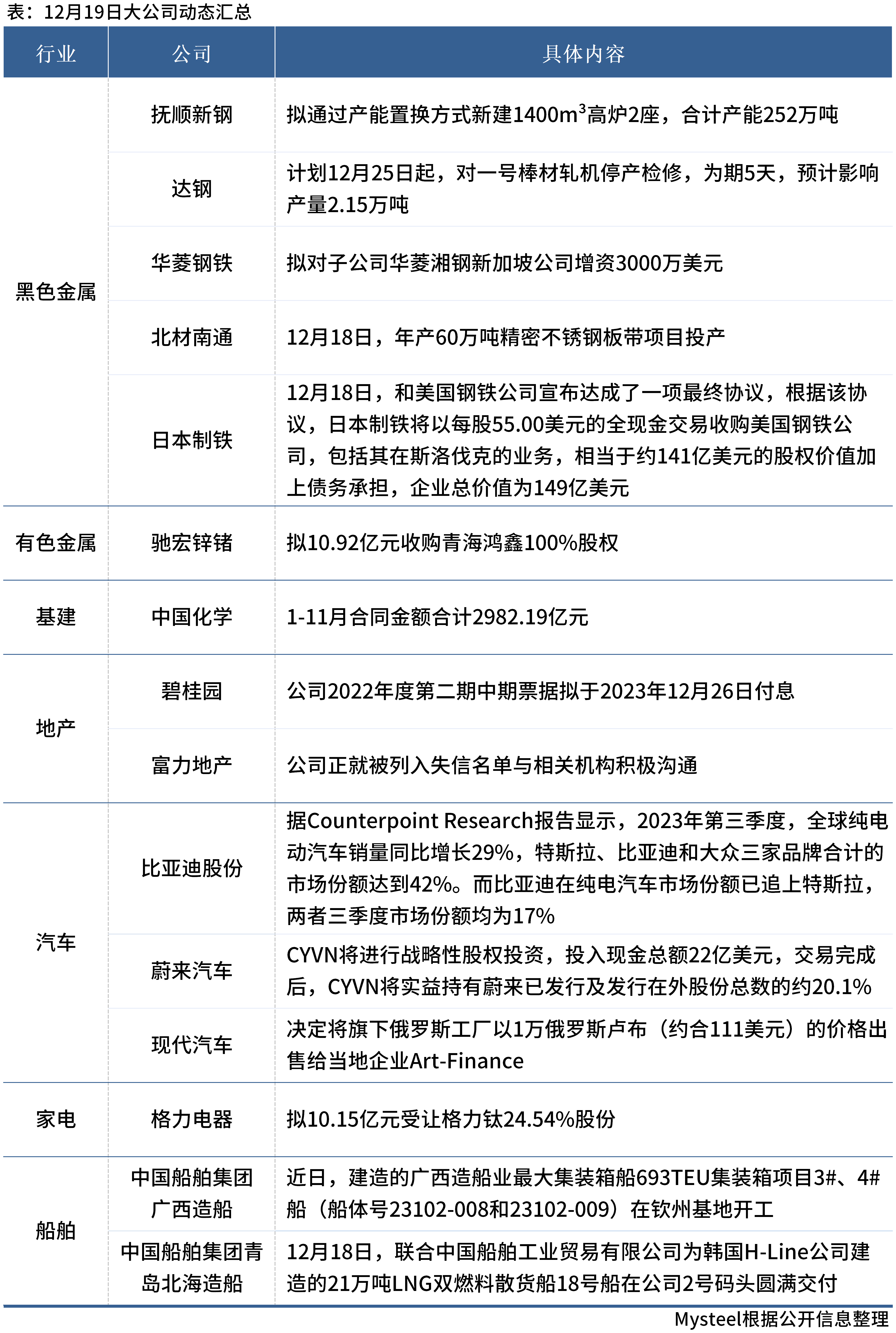12月20日,Mysteel匯總部分大宗商品相關(guān)企業(yè)動態(tài)。