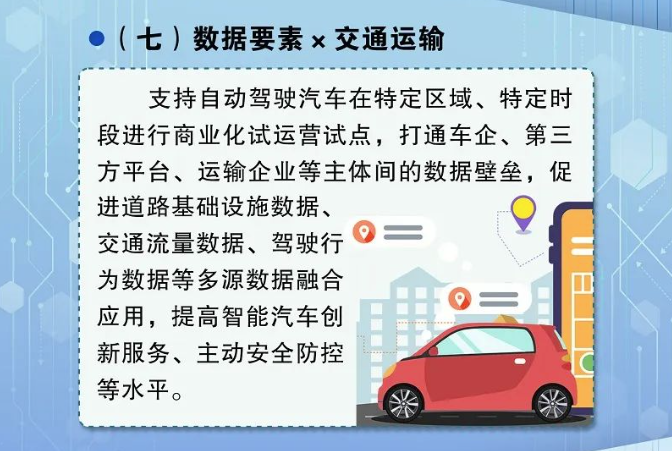 《“數(shù)據(jù)要素x"三年行動(dòng)計(jì)劃(2024-2026年) 》提出,推進(jìn)智能網(wǎng)聯(lián)汽車創(chuàng)新發(fā)展,支持自動(dòng)駕駛汽車在特定區(qū)域、特定時(shí)段進(jìn)行商業(yè)化試運(yùn)營試點(diǎn),打通車企、第三方平臺(tái)、運(yùn)輸企業(yè)等主體間的數(shù)據(jù)壁壘,促進(jìn)道路基礎(chǔ)設(shè)施數(shù)據(jù)、交通流量數(shù)據(jù)、駕駛行為數(shù)據(jù)等多源數(shù)據(jù)融合應(yīng)用,提高智能汽車創(chuàng)新服務(wù)、主動(dòng)安全防控等水平。