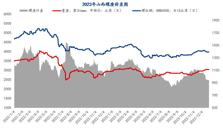 需求方面,2023年山西區(qū)域鋼廠多數(shù)時期處于虧損狀態(tài),廢鋼需求不佳,從螺廢價差來看,山西市場螺廢價差全年處于低位,整體低于去年,三四季度,在鋼材價格上行的帶動下,螺廢價差穩(wěn)步上行,鋼廠利潤好轉,同時疊加鋼廠冬季累庫需求,四季度山西區(qū)域廢鋼需求達到年內高位。