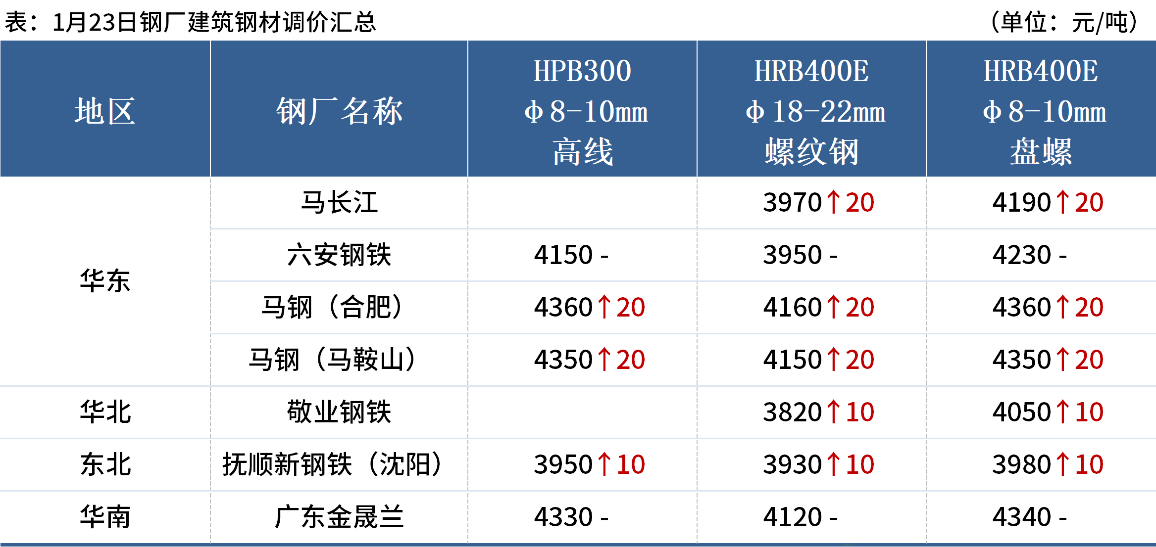 1月23日,全國累計6家鋼廠發(fā)布調(diào)價信息,其中4家鋼廠漲價,整體調(diào)幅在0-20元/噸。