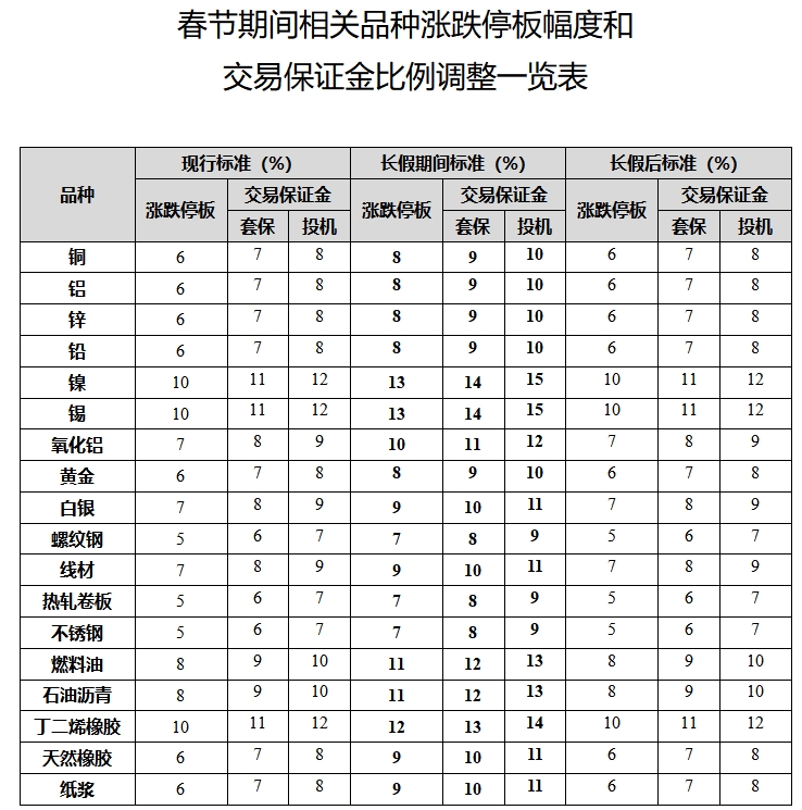 如遇《上海期貨交易所風(fēng)險(xiǎn)控制管理辦法》第十二條規(guī)定情況,則在上述交易保證金比例、漲跌停板幅度基礎(chǔ)上調(diào)整。