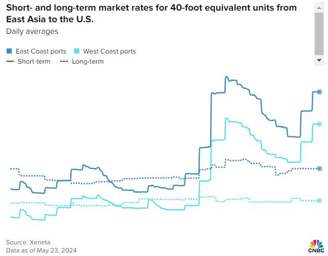 2024年初,紅海緊張局勢引發(fā)現(xiàn)貨運(yùn)費(fèi)急劇上升,隨后有所下降,但自4月底以來,通往美國海岸航線的現(xiàn)貨運(yùn)費(fèi)開始飆升,平均漲幅高達(dá)1500美元,運(yùn)營商收取的最高合同價(jià)格可以達(dá)到一個(gè)月前的兩倍多。