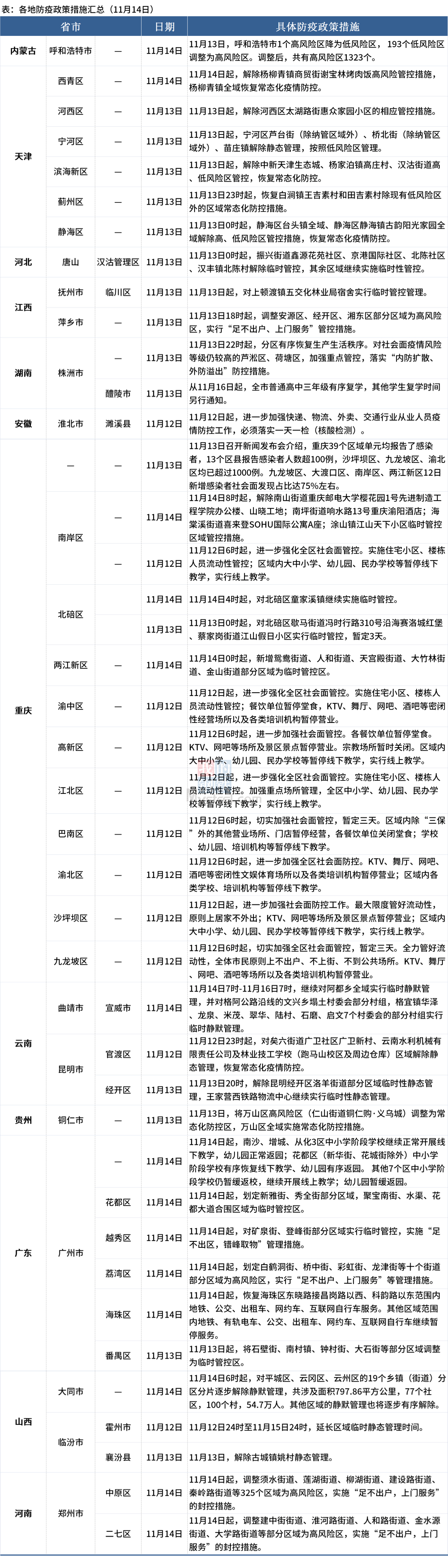 其中,河北唐山市漢沽管理區(qū)11月13日0時(shí)起解除振興街道鑫源花苑社區(qū)、京港國(guó)際社區(qū)、北陳社區(qū)、漢豐鎮(zhèn)北陳村臨時(shí)管控,其余區(qū)域繼續(xù)實(shí)施臨時(shí)性管控。廣東廣州市11月14日起,南沙、增城、從化3區(qū)中小學(xué)階段學(xué)校繼續(xù)正常開(kāi)展線下教學(xué),幼兒園正常返園;花都區(qū)(新華街、花城街除外)中小學(xué)階段學(xué)校有序恢復(fù)線下教學(xué)、幼兒園有序返園。 其他7個(gè)區(qū)中小學(xué)階段學(xué)校仍暫緩返校,繼續(xù)開(kāi)展線上教學(xué);幼兒園暫緩返園。山西大同市11月14日6時(shí)起,對(duì)平城區(qū)、云岡區(qū)、云州區(qū)的19個(gè)鄉(xiāng)鎮(zhèn)(街道)分區(qū)分片逐步解除靜默管理,共涉及面積797.86平方公里,77個(gè)社區(qū),100個(gè)村,54.7萬(wàn)人。其他區(qū)域的靜默管理也將逐步有序解除。